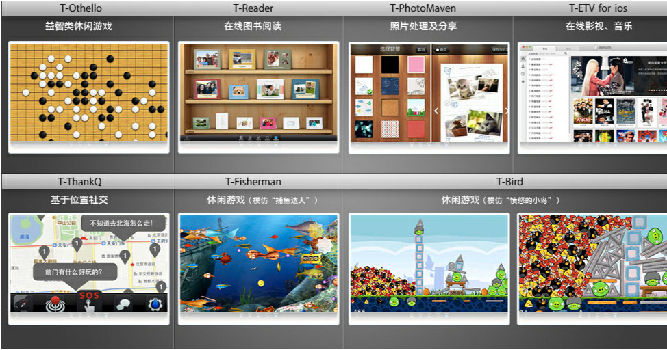 | 6 全真实训项目三 | 棋牌类游戏是iOS平台上五大类型游戏之一。T-Othello以流行的关卡设计,从易到难的计算机算法,人机对战模式和网络对战模式切换,漂亮的界面,非常好的可玩性,会吸引大量的棋迷参战。手机阅读器是任何一台iOS设备必备的工 具软件。现在,阅读器的功能越来越强大,越来越方便。T-Reader应该是一款值得你骄傲的产品。照片处理是iOS平台最常见的工具之一。提供一款使用方便,功能独特,个性十 的照片处理软件,是大家所期待的。T-PhotoMaven 不仅具备大部分照片处理软件所具有的功能,还具备生成影片功能,将自己的一些照片制作成影片,再配合背景音乐,分享给朋友们,是多么美妙的事。音乐和电影是iOS设备必备的功能。相关的软件也非常的多。T-ETV for iOS可以处理音乐、电影、下载、管理、在线观看等功能。T-ThankQ 是一款利用用户位置信息提供用户周围互帮互助功能的移动应用。你可以在任何时候,任何地点寻求任何他人的帮助,自然你也可以帮助他们获取积分。你也可以和你周围的人互动,聊天,交友,分享等。当然,你也可以将你们感兴趣的内容发送到微薄。 | |