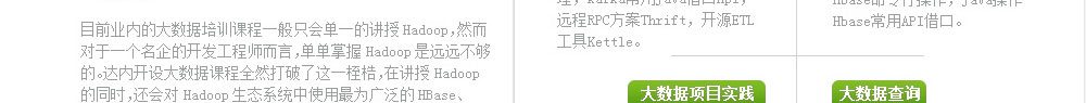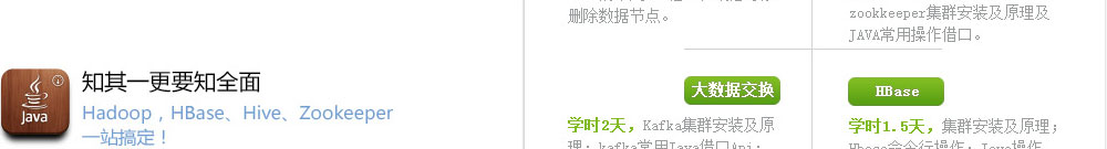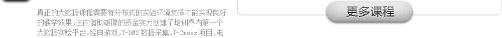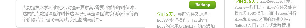 | 模块 | 课程内容 | Hadoop | 集群安装及原理;hdfs命令行操作;Java操作hdfs的常用API接口;动态添加删除数据节点。 |