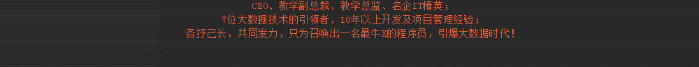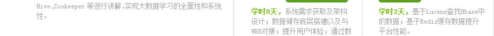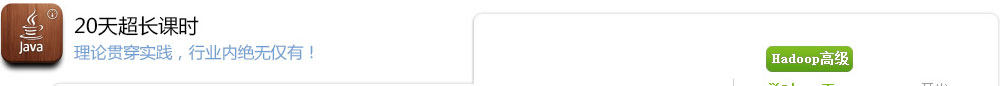 | Hadoop高级 | MapReduce开发;Flume抽取日志;Hive安装及命令行操作及JDBC操作;通过Sqoop进行Hive和 MySQL之间的数据交换;MaHout入门; 分布式集群管理zookeeper集群安装及原理及Java常用操作接口。 |