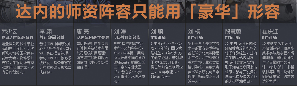 • 设计师绝不是只会使用设计工具、没有设计灵魂的美工。达内UID设计师培训从点、线、面绘画原理讲起,涵盖色彩原理、空间表现、创意思维等内容,重点培养设计思维,帮助设计师突破作品缺乏创意的职业发展 颈,成为顶尖的设计师。