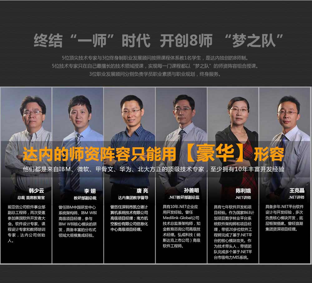 | 企业高级开发 | • SQL基础语法 • N层架构的原理与实现 • SqlHelper • Nhibernate • Entity Framework • CodeSmith使用 • UML • 面向对象设计原则 • 设计模式 • 软件过程和软件活动 • AOP编程 • WebService编程 • WINDOWS服务编程 |