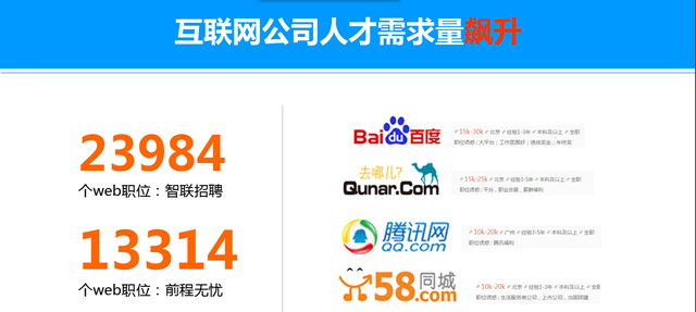 随着互联网企业的高速发展,电商的迅猛发展,不断推动了对职位的不断细分,于是产生了web前端工程师,互联网公司对前端人才的需求飙升,让web越来越火。如果我们试着在招聘网站搜索web这个职位,智联招聘有23984个职位需求,前程无忧也有13314个公司在招聘web前端人员。