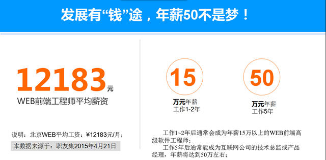 毕业后,将通过"名企内部推荐赢得WEB前端工程师的高薪职位,目前平均薪资可达到7~8K;工作1~2年后通常会成为年薪15万以上的WEB前端高级软件工程师,工作5年后通常能成为互联网公司的技术总监或产品经理,年薪将达到50万左右。