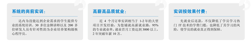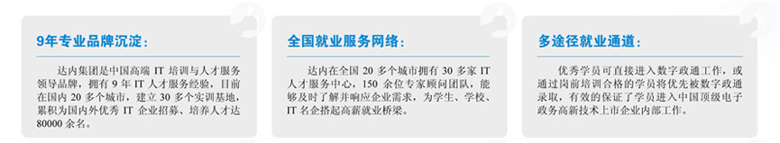 达内集团是中国高端IT 培训与人才服务领导品牌,由美国国际数据集团IDGVC 和日本集富亚洲JAFCO ASIA 共同投资,经过9年积累,达内集团在Java、C++、.Net、3G 嵌入式、PHP、软件测试等多个方向与国内外一流IT 企业进行人才深度合作,为企业提供人才定制培养、软件人才推荐、代理校园招聘,高级人才猎头等多种服务,目前合作企业已达上万家,并已累计为IBM、微软、摩托罗拉、华为、中软、用友、Yahoo、阿里巴巴、TOM、新浪、搜狐、百度、联想、海辉、文思、软通动力等知名IT 企业培养并输送了8 万多名中高级软件人才,成为IT 企业选拔人才,IT 人才入职名企的首要选择。