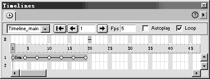 按Ctrl+F9键打开时间链浮动工具面板。选取其中幻灯片所在层(Layer_main)中的初始图片(确保选取的是图像,而不是层),用鼠标拖至时间链浮动工具面板,在时间链起始处释放鼠标。设定帧速率为Fps为5,并勾选Loop框。选择时间链中的其中一帧,右击鼠标,选择"Add Keyframe"(添加关键帧),选择另一幅幻灯片图片,以更换层(Layer_main)中的初始图片。重复这个操作,将剩下的5幅图片全部加到该时间链的不同关键帧上。最后适当调节各关键帧之间的距离。并将该时间链命名为TimeLine_main。建立好的时间链如图所示。