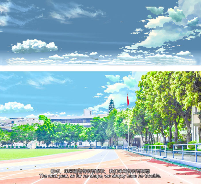 7、最后就是天空的部分,把天空抠出来,再找一张适合的天空素材加进去,适当调色融合进画面里面。最后可以加上类似足迹的字幕等。