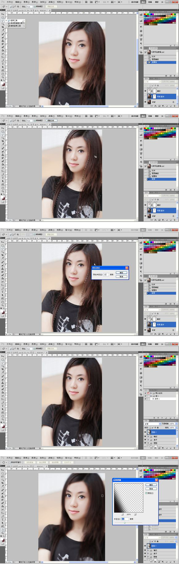 30、头发部分:话说头发我也是硬伤,头发的方法是有很多的,这里为了省时间就介绍比较简单的一种,选择套索工具选择大概的头发轮廓,看不清楚的可以把【背景副本图层】关闭先。