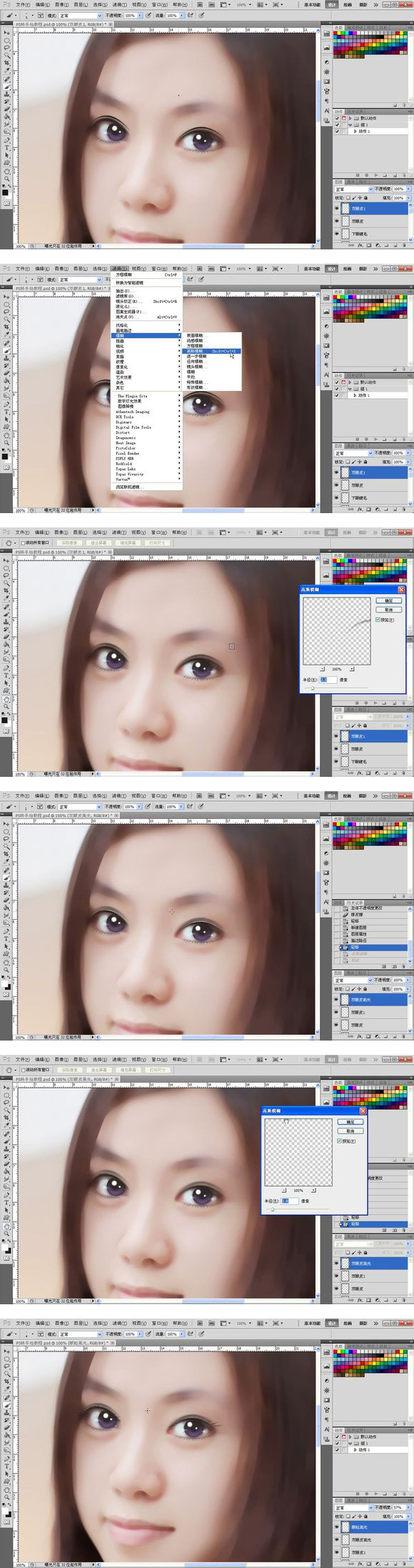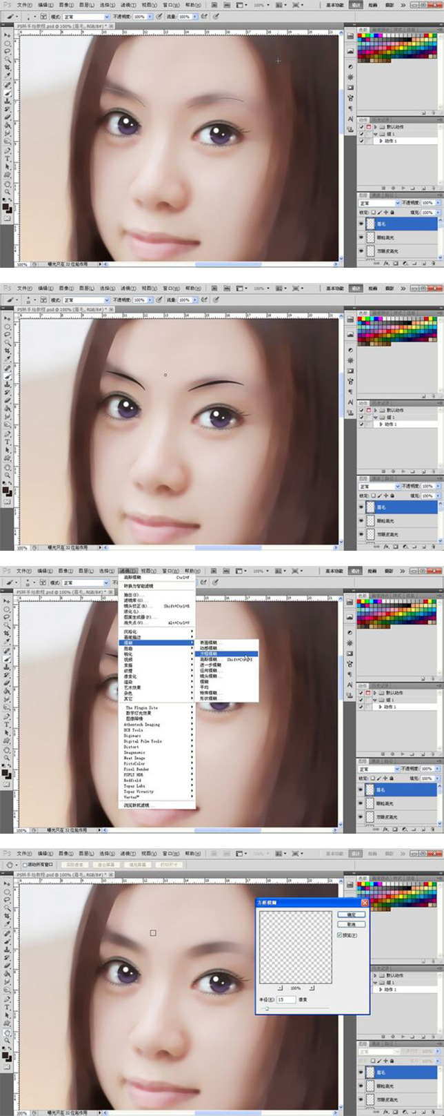 21、接下来就是眉毛了,眉毛相对比较简单,如图所示勾两条路径,吸取眉毛那里的颜色描边,大概10像素左右,执行方框模糊效果如图所示。再勾一些小路径,一样模拟压力描边,高斯模糊一下,适当降低透明度,完成眉毛。