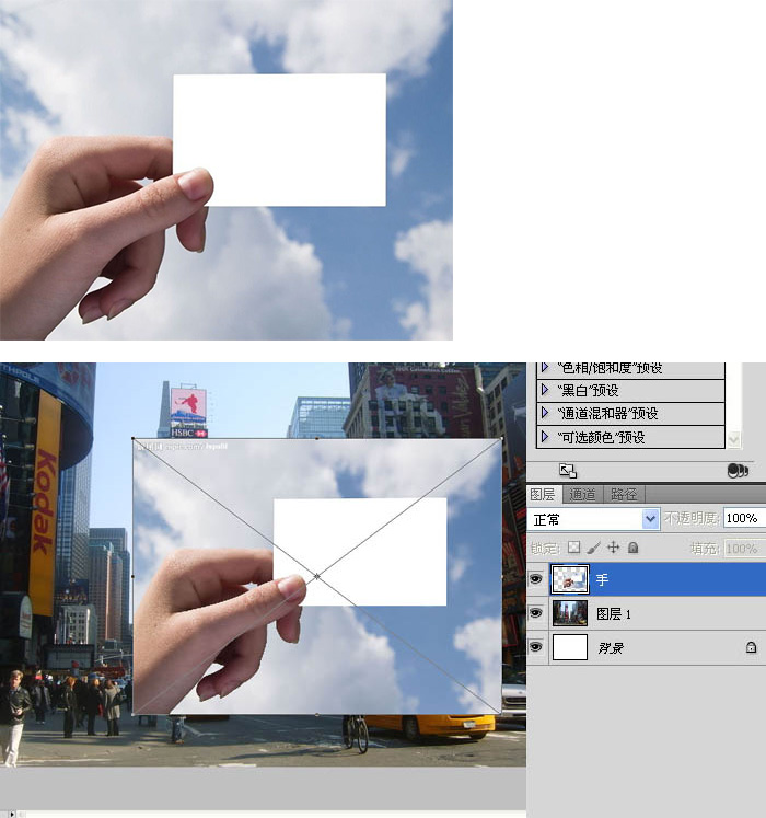 6、现在我说个细节,因为是N年前拍的老照片,广场上的广告牌肯定早就换过了。所以我找了几张小图片把老照片和现在广场中广告牌有衔接的都更换了一下。