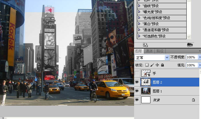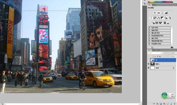 4、单击图层前面的眼睛把手隐藏,拉一个照片的选区。把时代广场Ctrl+J一张出来。