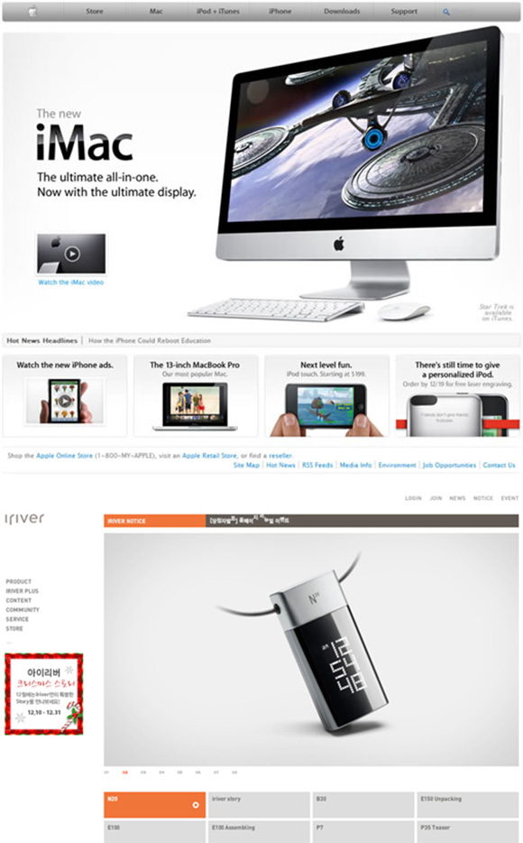 细化产品具体定位,如apple,韩国手机iriver高科技电子产品,其简洁灰白色调给网站带来科技感和现代感。