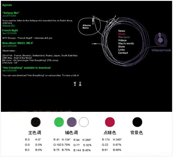 黑色的背景下所使用的颜色面积虽然不多,但由于黑色这一衬托放大的特性,其他颜色较容易引起浏览者的注意,充分发挥其设计意图。