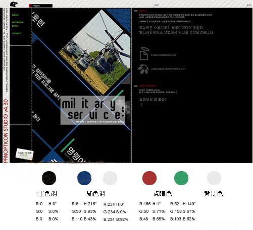 这里的点睛色主要都运用在文字功能上,红色几乎是正红,由于降低了纯度和明度,该颜色不明显。绿色H数值为149,正绿色为120,色相上稍向蓝色倾斜,纯度和明度不高,因此该颜色也不明显。