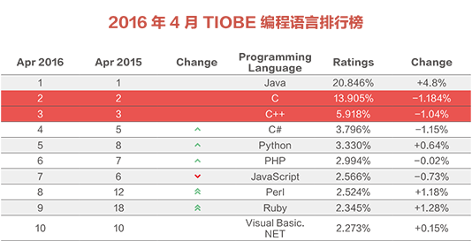 据世界权威语言排行榜(TIOBE)的最新数据显示(2016 年 4 月),C 和 C++ 语言已分别