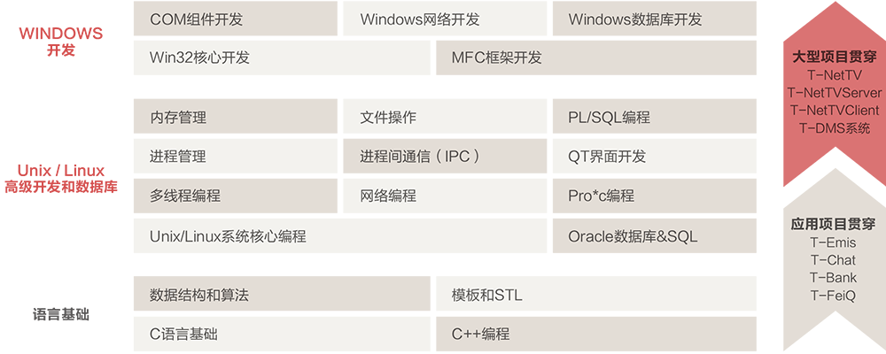 | 标准c语言开发 | 计算机基础、linux操作系统、linux文件系、linux系统常用命令、V的使用、简单 Shell脚本简介及编程、环境变量以及常用工具软件 C语言基本语法、gcc编译器、数据类型、变量和常量、运算符和表达式、分支语 句、循环语句、数组、函数、指针和字符串、结构、联合、枚举、指针高级应用、多 级指针、void指针、函数指针、内存管理、文件流操作、预处理、其他常用C标库、 Makefile编写 |