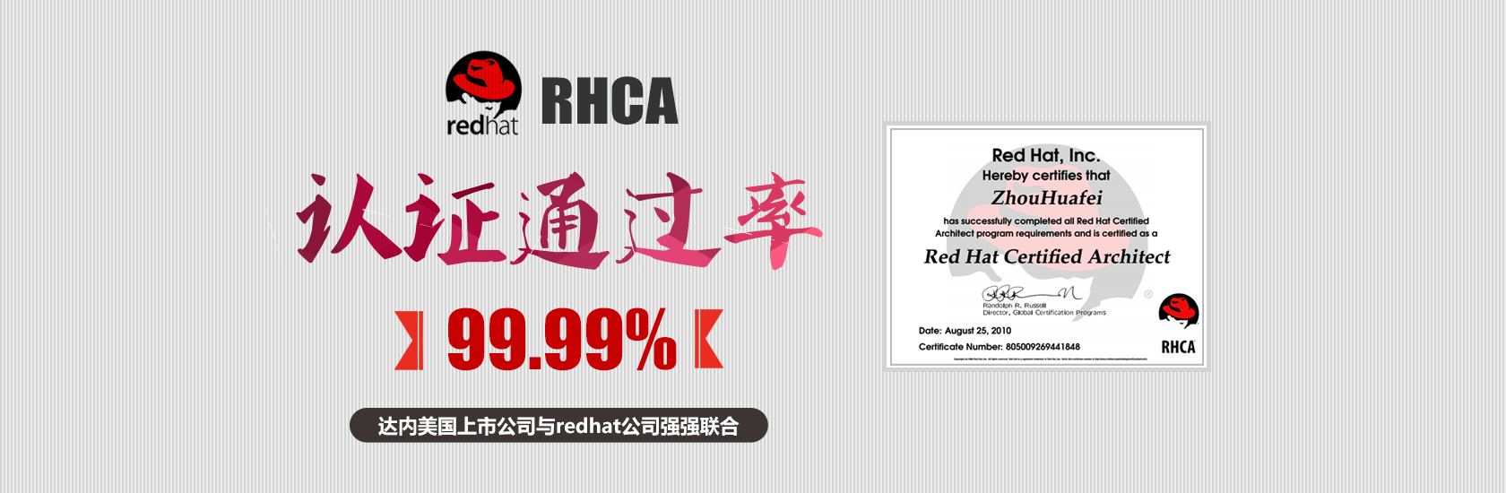 2014年5月,达内科技与红帽公司达成战略合作,成为红帽中国官方授权培训中心和考试中心,承担RHCE(红帽认证工程师)、RHCA(红帽认证架构师)认证的培训及考试,课程涵盖服务器运维和云计算技术从基础到高端各个层面。