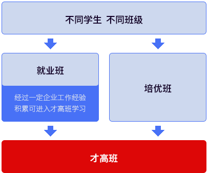 同一课程方向,不同受众群体,提供就业、培优、才高三个级别教学课程。