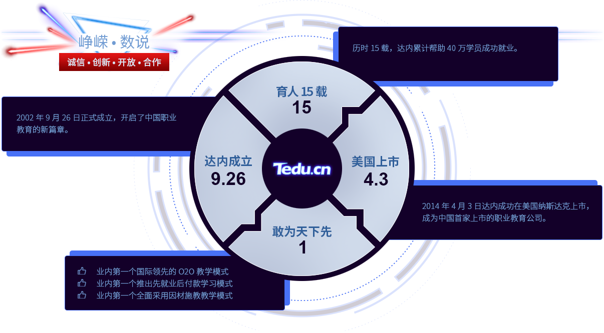 达内时代科技集团有限公司【美股交易代码:TEDU】(简称达内集团)成立于2002年9月。2014年4月3日成功在美国纳斯达克上市,成为中国赴美国上市的职业教育公司,也是引领行业的职业教育公司。