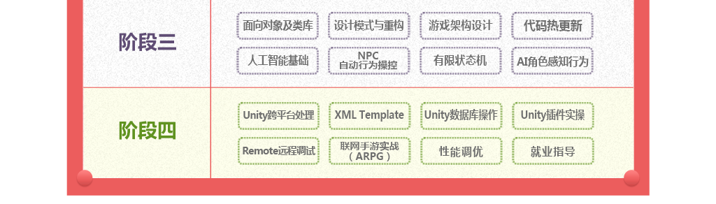 Unity课程设计思路以实用为核心,以游戏脚本编程为重点方向,以真实功能为进步阶梯。以高端技术为竞争力,以项目经验为学习目标。